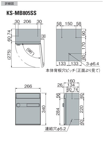 品名・品番 集合郵便受箱 KS-MB805SS-L(前入前出) 錠前 静音大型ダイヤル錠 サイズ・質量 H340xW266xD160 2.5kg 仕上げ 本体 No4仕上 扉・投入口 ヘアライン仕上 アクリル焼付塗装 色:クリア 材質 本体 ステンレス(SUS304) t=0.7mm 扉・投入口 ステンレス(SUS304) t=1.0mm ●スペースに合わせて自由に組み合わせ可能な壁付薄型タイプ。